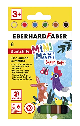 Eberhard Faber 518905 Mini Kids Jumbo färgpennor i 6 färger, 3 i 1 med vaxmåla, akvarell färgglad penna, påfyllningstjocklek 10 mm, okrossbar, i kartongfodral, för målning och teckning, flera färger