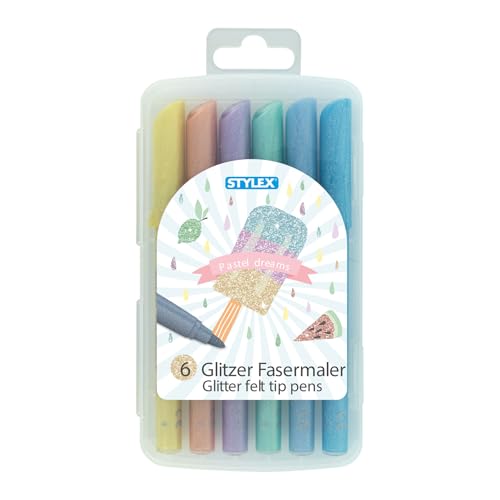 Stylex 64017 – Glitter fibermålare, 6 stycken i pastellfärger, färgintensiv, tvättbar, i återförslutningsbar låda, för målning, hantverk och teckning, filtpennor för barn