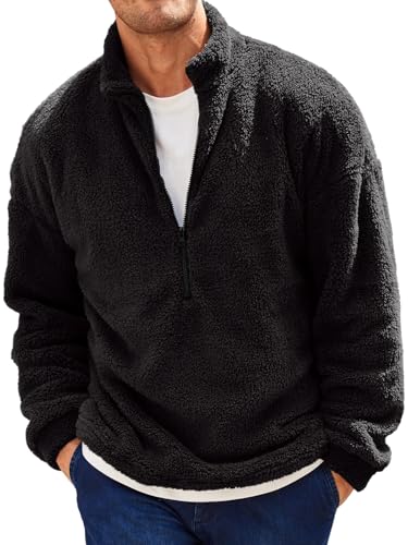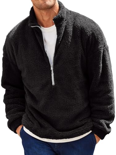 Runcati herr plyschtröja 1/4 dragkedja teddy-fleece sweatshirt luddig sherpa toppar lätt avslappnad baströja toppar höst vinter, svart, XL