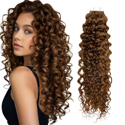 RUNATURE Lockigt Tape Extensions äkta hår brunt äkta hår 20 stycken förlängningar lockar äkta hår tejp 50 cm bruna förlängningar äkta hår tejp lockar osynlig hårförlängning 50 g #4NW