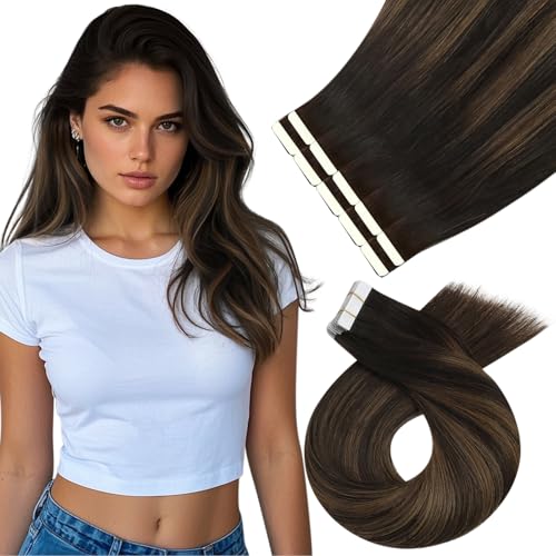 Moresoo Tape in Extensions äkta hår 60 cm Balayage Tape Extensions äkta hår mörkbrun med karamellblond tejp i hårförlängningar, hårförlängning #P4/27, 50 g, 20 st
