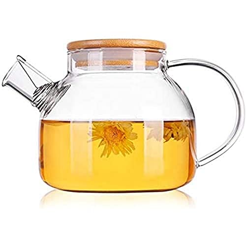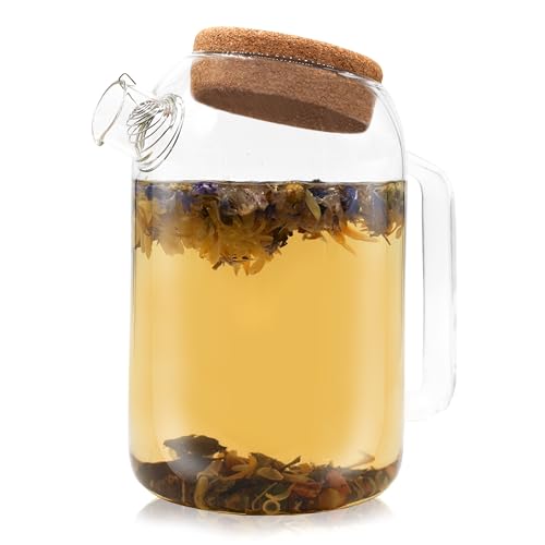 e - 1L transparent tekanna i glas med filter i rostfritt stål - värmebeständigt borosilikatglas - korkpropp - en idealisk tekanna för att infusera blommor och växter