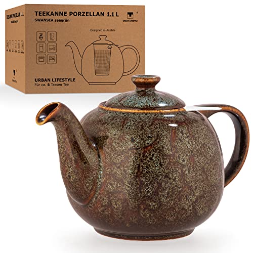 Tekanna med siktinsats Swansea havsgrön 1,1 l med filter, tillverkad av porslin från URBAN LIFESTYLE, tekanna som är droppfri. Tekanna med sil porslin
