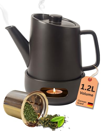 DEKAZIA® Tekanna i Keramik med Sil och Värmare - Svart Porslins Tekanna 1,2L för Löste med Rostfritt Stål Filter och Värmeljushållare