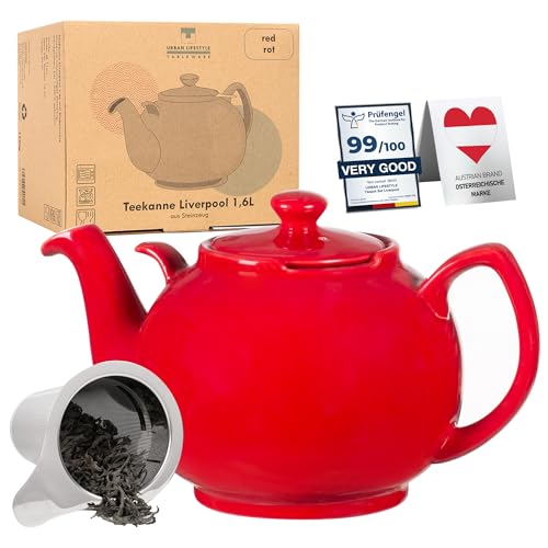 Urban Lifestyle Tekanna keramik 1,6 l Liverpool (röd) droppfri tekanna teapot med sil insats rostfritt stål filter avtagbart