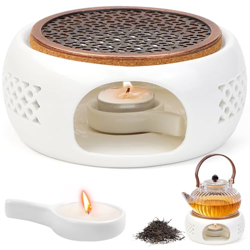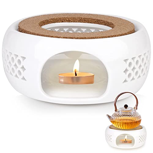 BHHTBB värmare för tekanna, keramik, tekannvärmare, tevärmare, keramik, testövlar, vit, koppar, porslin, ø 15 cm, med korkmatta för att bevara värmen, te kaffe mjölk