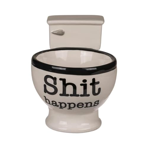 Avilia Kaffe- och tekopp i form av toalett - rolig kopp med badrumsdekoration och Shit Happens-skrift, i keramik, 16 x 12 cm, 250 ml, svartvitt