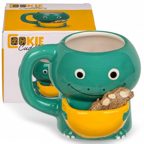 MIJOMA Kaffekopp, kaffekopp, tekopp med kakfack, kakkopp, kakkopp, Cookie Cuddlers handtagsmugg med kakhylla, 400 ml av keramik (dinosaurie)