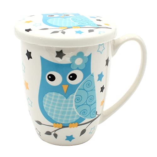 Dekohelden24 Tekopp i keramik inkl. metallsil och lock, med ugglemotiv i blått och stjärnor, storlek: H/Ø ca 11 x 8 cm, kapacitet ca 250 ml