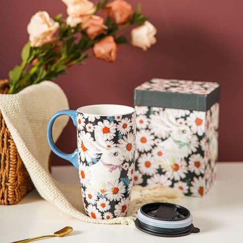DUSVALLY Keramisk mugg stor kaffekopp höga muggar porslin latte tekopp med lock 17 oz, kanin