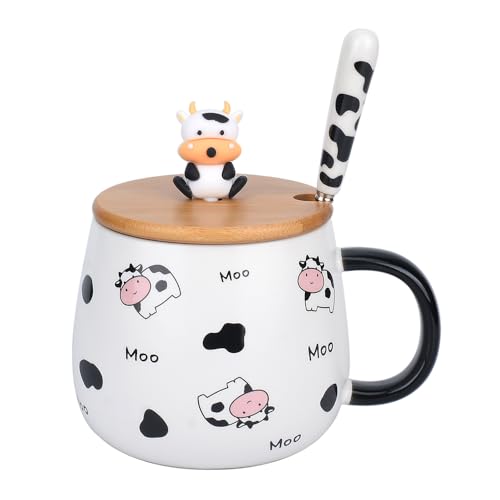 XinHuiGY Gulligt djur kaffemugg med lock och sked, söt ko tryck saker gåvor, keramisk tekopp, Kawaii kopp, tecknad kaffekopp present till kvinnor kontor och personlig födelsedag jul 480 ml