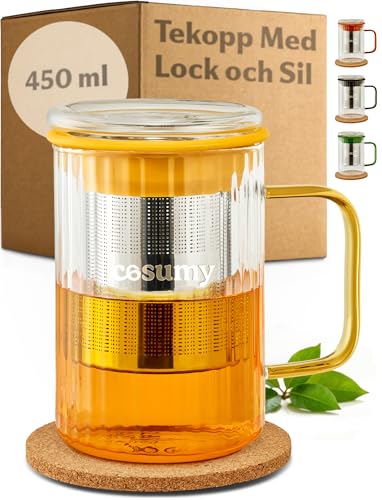 Cosumy Tekopp Med Lock och Sil 450ml - Värmebeständigt Tekoppsglas Med Handtag i Färgat Borosilikatglas - Med Korkunderlägg & Filter i Rostfritt Stål