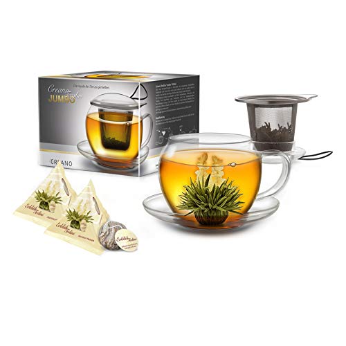 Creano XXL tekopp med handtag Jumbo med integrerad sil av rostfritt stål, lock och underlägg i en uppsättning med 2 blommande Teelini, 450 ml