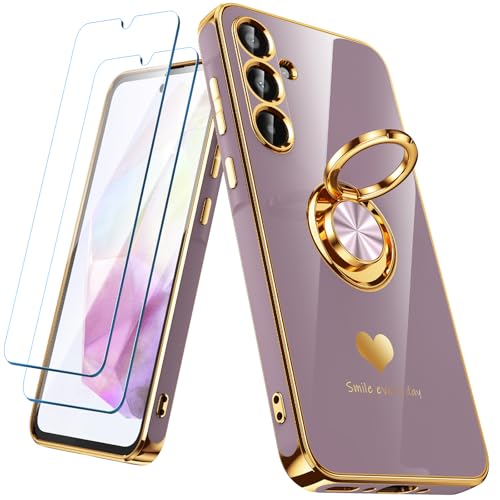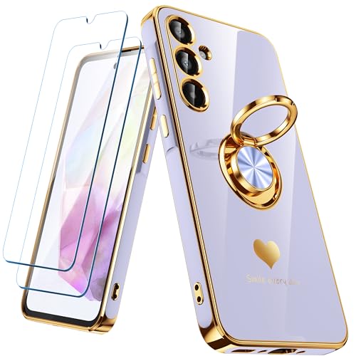 Icke-ional för Samsung Galaxy A35 5G fodral med 2-pack skärmskydd, 360° roterbar ringhållare [lyxigt hjärtmönster] plätering guldkant smal mjuk telefon fodral fodral för Galaxy A35 – lavendel