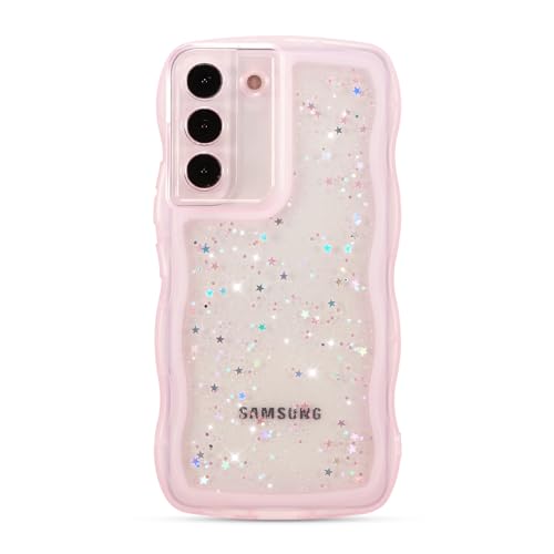 ZTOFERA för Samsung Galaxy S22 Plus 5G sött lockigt vågfodral med stjärnglitter, klar blank bling mjuk TPU stötsäker telefon skyddande fodral för kvinnor flickor – rosa