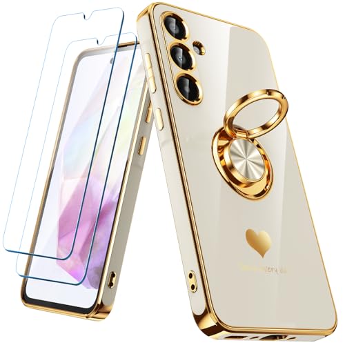 Icke-ional för Samsung Galaxy A35 5G fodral med 2-pack skärmskydd, 360° roterbar ringhållare [lyxigt hjärtmönster] plätering guldkant smal mjuk telefon fodral fodral för Galaxy A35 – vit
