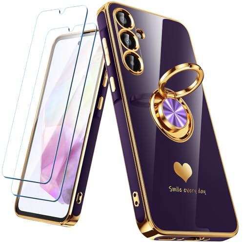 Icke-ional för Samsung Galaxy A35 5G fodral med 2-pack skärmskydd, 360° roterbar ringhållare [lyxiga hjärtmönster] plätering guldkant smal mjuk telefon fodral fodral för Galaxy A35 – lila