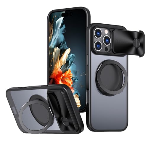 MEIQIBAO Magnetiskt fodral för iPhone 16 Pro med glidbart kameraskydd 360° roterbart metallstativ med kameraskydd stötsäker telefon frostat fodral svart