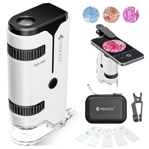 Mini Pocket Microscope 100x-250x för Vuxna Barn, Portabelt Mikroskop med 5 Mikroskopblad, Telefonadapter, Portabelt Miniskop för Vuxna Barn, Vetenskaplig Utbildning, Vit