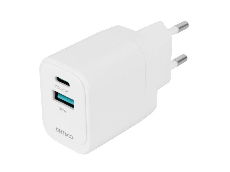 Telefonladdare Deltaco Usbc-Ac155, 1X Usb-A 18 W, 1X Usb-C 30 W, Vit