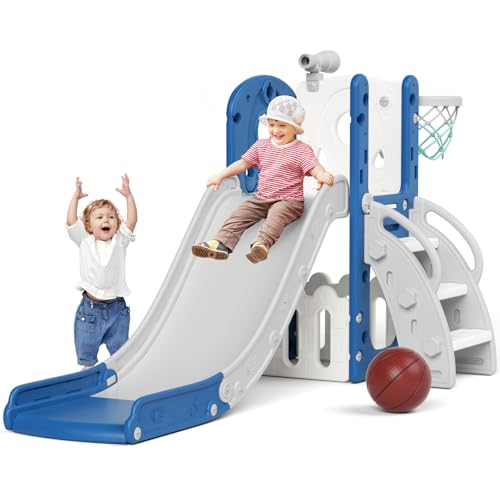 XJD Barnrutschkana 5-i-1 småbarn babyrutschkana, klättrare med basketring, teleskop, förvaringskorg, trädgård, klättringsramar för barn, lekset, inomhus- och utomhusrutschbana för barn, ålder 1-3, blå