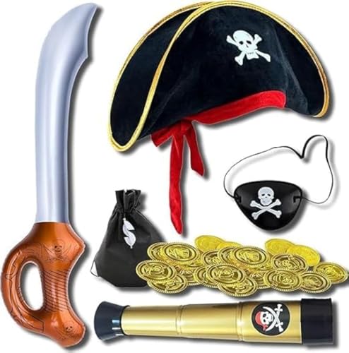 LATERN 8 stycken piratdräkt barn, piratdräkt tillbehör med pirathatt dödskalle korsade ben ögonflik svärd skattkort uppblåsbart teleskop guldmynt för barn piratfest cosplay