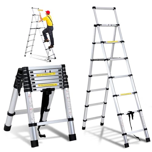 LZQ Teleskopstege 1,7 m + 2 m, aluminium fällbar stege utdragbar stege A-ram 6 + 7 steg, multifunktionsstege, utdragbar stege halkfri för högklättring, 150 kg lastkapacitet