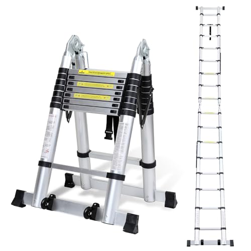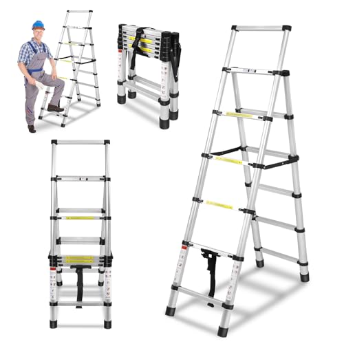 Nictemaw 5 m teleskopstege, teleskopstege av aluminium 150 kg lastkapacitet, 2 i 1 fällbar stege multifunktionsstege av aluminium, för inomhus- och utomhusbruk