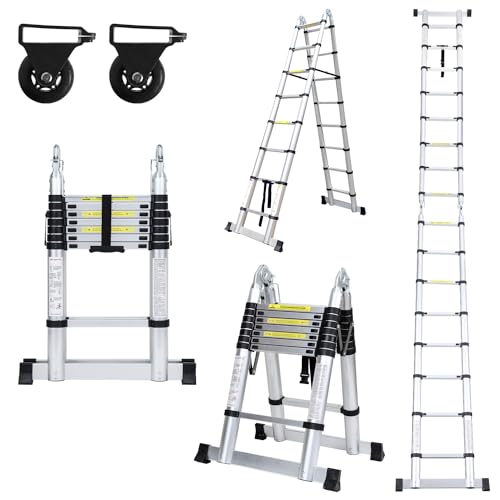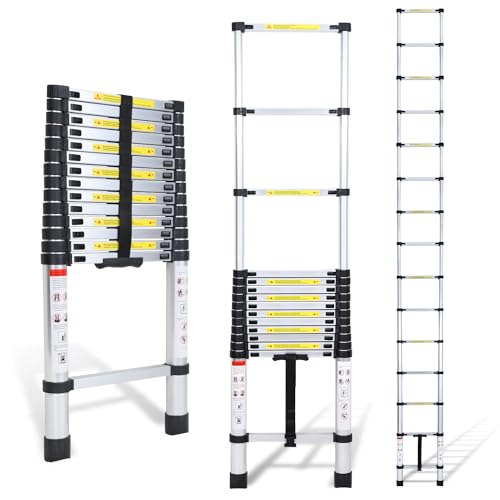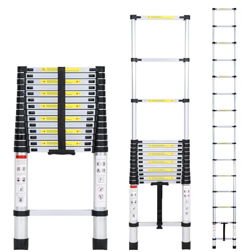 Cecaylie Hopfällbar teleskopstege i aluminium, 3,8 meter utdragbar stege, halkfri aluminiumstege, stående stege, multifunktionsstege, utdragbar aluminiumstege, utdragbar teleskopstege med 150 kg lastkapacitet