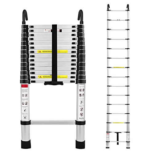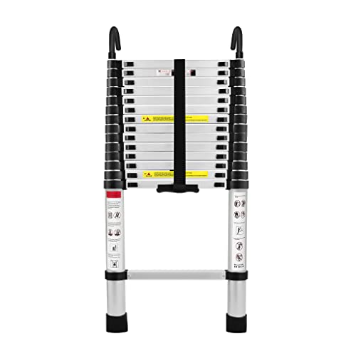 Cecaylie Teleskopstege 3,8 m aluminium multifunktionsstege med 2 avtagbara krokar, stege teleskopdesign, 150 kg/330 pund lastkapacitet, stående stege halkfri, svart