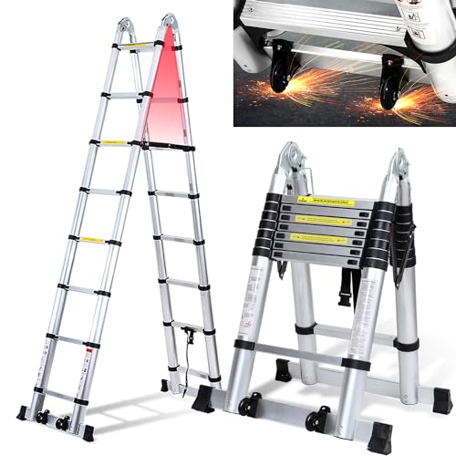 Cecaylie 5 m (2,5 + 2,5) teleskopstege, hopfällbar stege aluminium med avtagbara dubbla remhjul, maximal belastning 150 kg/330 pund, utdragbar stege, halkfri, silver