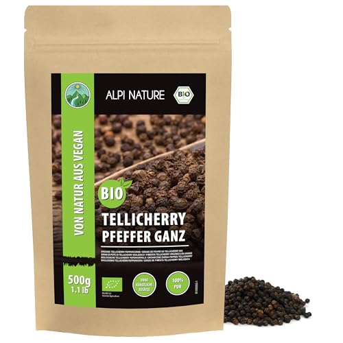 Alpi Nature EKOLOGISK Tellicherry svartpeppar (500g), ekologisk svart Tellicherry peppar, Tellicherry svartpeppar från kontrollerad ekologisk odling, laboratorietestad, 100 procent ren och naturlig
