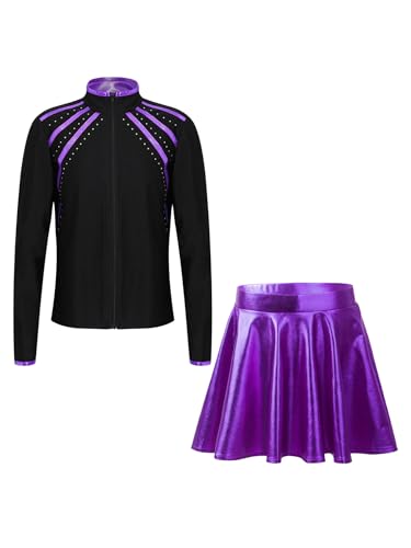 Yeahdor barn flickor konståkning kläder set långärmad konståkning rock med sportkjol tennis kläder set träning sport, lila, 134-140