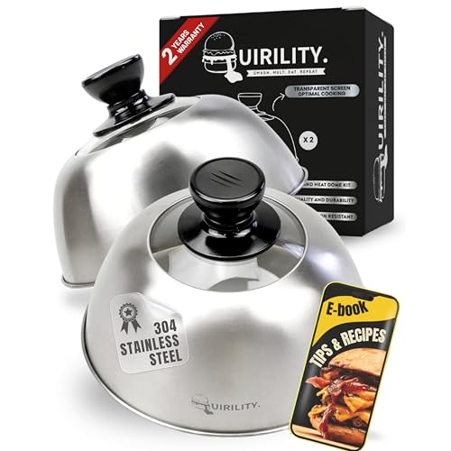QUIRILITY | Burgerklocka i rostfritt stål | 2 stycken | Värmebeständigt handtag och transparent siktglas, Smash Burgertillbehör för Cheeseburgare, grill, teppanyaki