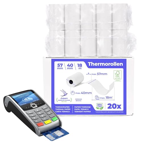 SWIPARO Termisk pappersrulle 57 x 40 x 12 mm för alla POS-enheter och termisk skrivare, termisk pappersrulle, 57 mm x 40 mm x 18 m, perfekt för kreditkortsmaskiner, POS-papper [20 x ]