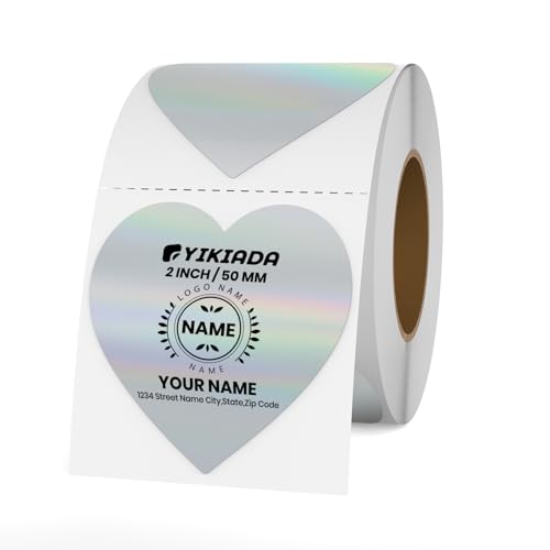 YIKIADA Silver hjärta termoetiketter vinyl 50 mm holografisk rulle självhäftande vattentäta klistermärken för logotyp streckkod QR-kod barn kontor hem 200 stycken