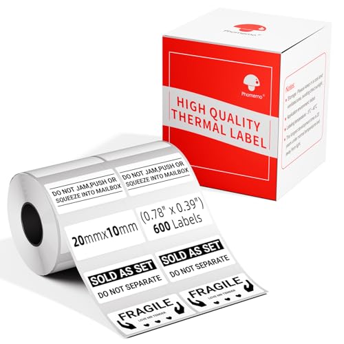 Phomemo M110/M220/M221/M200/M120/M100/M108/M150/M250/M260 multifunktionella självhäftande etiketter, 20 x 10 mm (0,78 x 0,39 tum) termoetiketter för Phomemo etikettskrivare, 600 etiketter per rulle