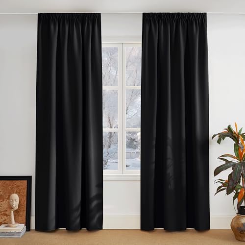 PONY DANCE Värmeisolerande gardin, veckband, set om 2, H 260 x B 140 cm, termogardin, köldskydd, ogenomskinliga gardiner för skensystem, sovrum, gardiner, svart