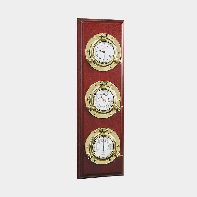 Väderstation Autonautic Atlantic 95 Minor EG, 350 x 130 mm, med skeppsur, barometer & hygrometer / termometer, Ø70/95 mm, trä med guldpläterad mässing