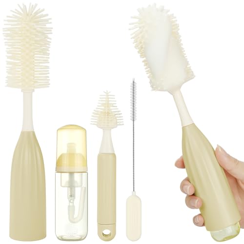 Vicloon Babyflaskborste, Press-till-skum vattenflaska borste med napp och sugrör rengöringsborstar, silikonrengöringsborstar för rengöring av vattenflaskor babyflaskor glaskopp termosar sugrör (kaki)