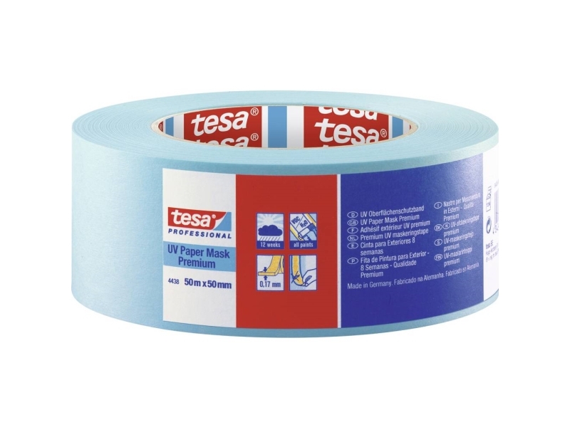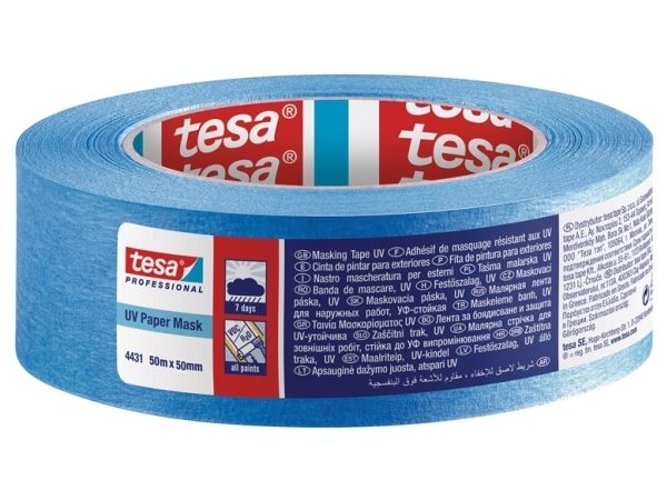 tesa Precisionsrep 4440 utomhus UV-PLUS målningstejp – 4-pack – väderbeständigt målarbrapp för utomhusbruk – för exakt maskering och täckning – blå – 50 m x 38 mm vardera