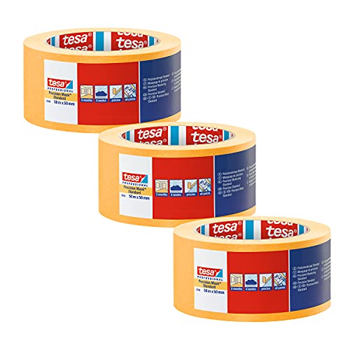 tesa Precisionskrepp 4344 standard – 3-pack – professionell målningstejp med tunn pappershållare – för exakt maskering och täckning – orange – 50 m x 50 mm vardera