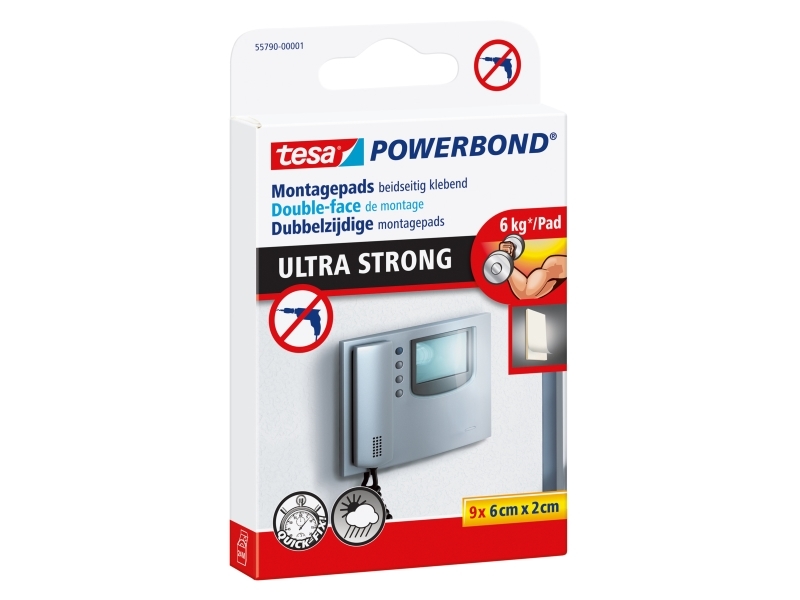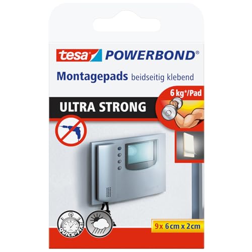 tesa Powerbond Ultra Strong häftkuddar - dubbelsidiga kuddar för inomhus- och skyddad utomhusinstallation - ultrastarkt häftämne på båda sidor - förpackning med 9 kuddar