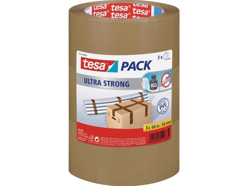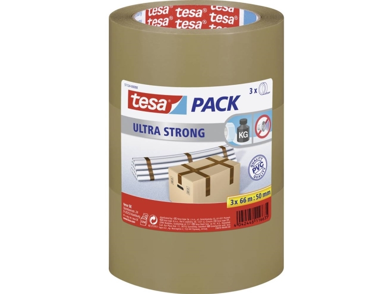 tesapack Ultra Strong packtejp - Självhäftande, lösningsmedelsfri och extra rivsäker packtejp i set med 3 rullar - brun PVC - 66m x 50 mm