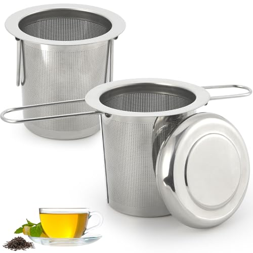 2 stycken tesil för löst te av rostfritt stål 18/8, mycket fin sil för te med lock/droppskål, rymligt tefilter med brett dubbelhandtag för tekanna/kopp/diskmaskinssäker