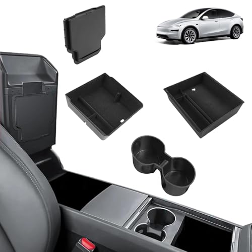[4 stycken] GAFAT Ny Tesla Model Y Juniper 2025 2026 mittkonsol förvaringsbox-set, 2 arrangörer för armstöd av flockning, 1 mugghållare och 1 dold låda, för 2026 Tesla Model Y tillbehör 2025
