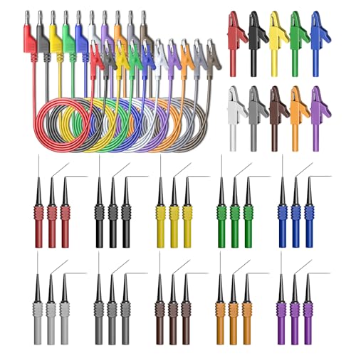 Cleqee 50 stycken bakre provsats 4 mm banankontakter till koppar krokodilklämma testkablar kit med 3 konfigurationer backprov stift för bilreparation diagnostik
