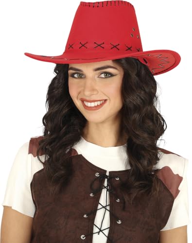 FIESTAS GUIRCA | Äkta lädercowboyhatt (en storlek) - Kostymtillbehör för Old West, Texas och Carnival Party - Perfekt för Cosplay och Halloween - För Vuxna Unisex- Röd