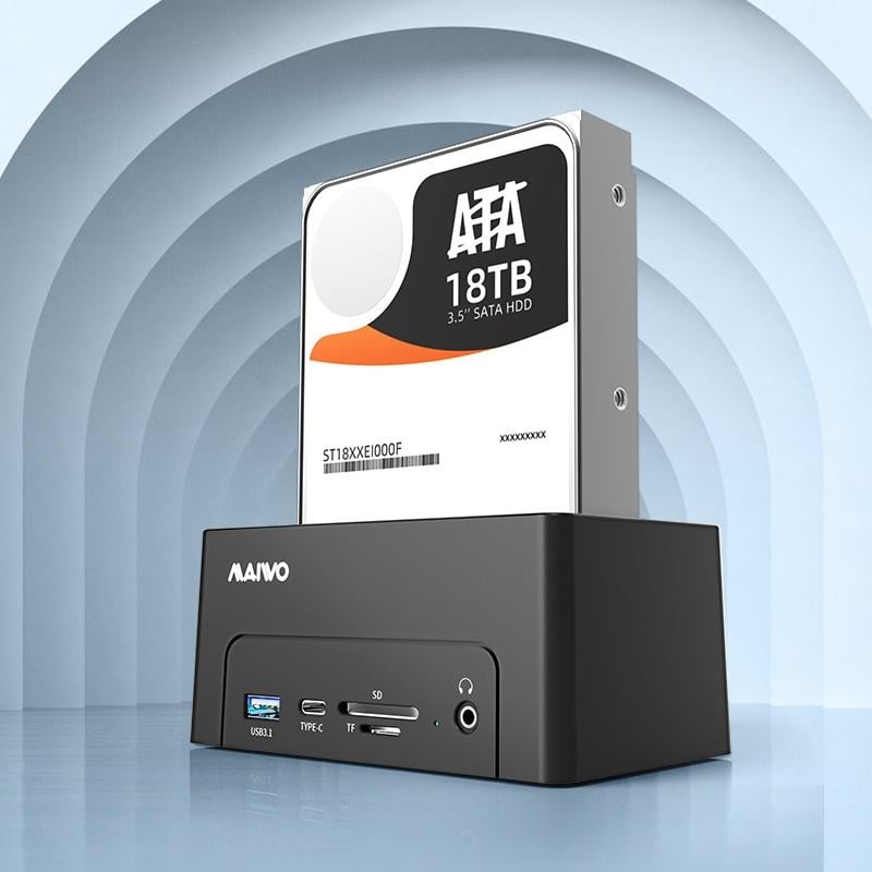 Maiwo USB-C Dockningsstation 2,5"/3,5" 2x SATA HDD SSD & SD/TF-minneskort, HDMI2.0 4K60Hz RJ45 GigaLan USB-A & USB-C 10Gbps