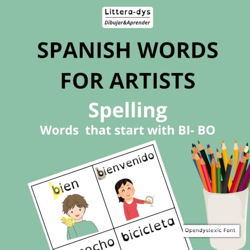Spanish Words for Artists: Spelling. Words that start with BI-BO: 60 words to learn spanish. Opendyslexic typography. Cream colored paper